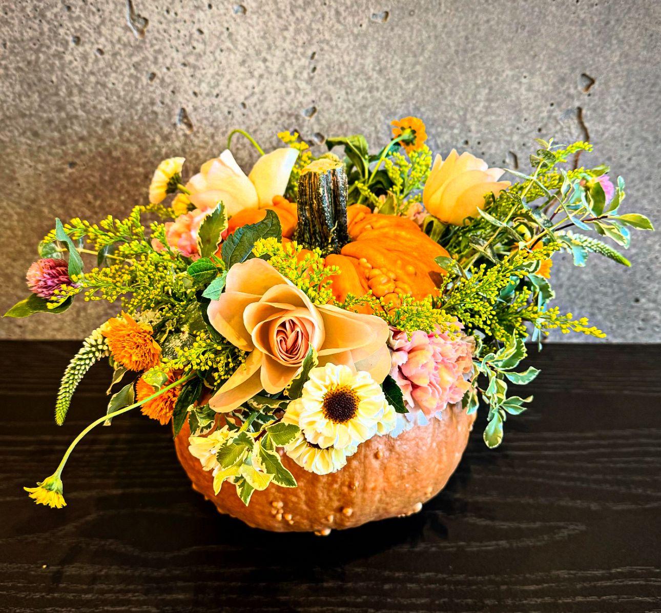 Bring the cozy fall vibes to your table with our signature floral pumpkins: real knobby pumpkins, overflowing with fresh seasonal blooms and textural greenery.