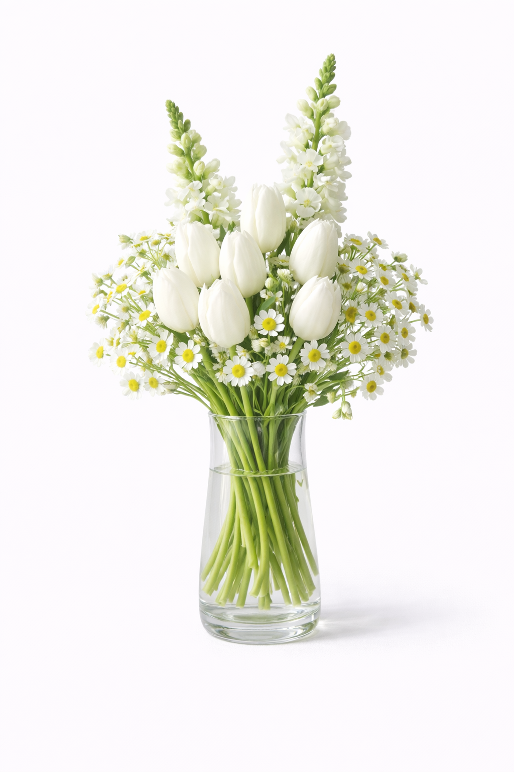 Fresh, simple, and full of heartfelt charm, Purely Yours is a bouquet that celebrates love in its most natural form. This arrangement features tulips, creating a soft, elegant foundation, paired with feverfew blooms for a light, airy touch.
