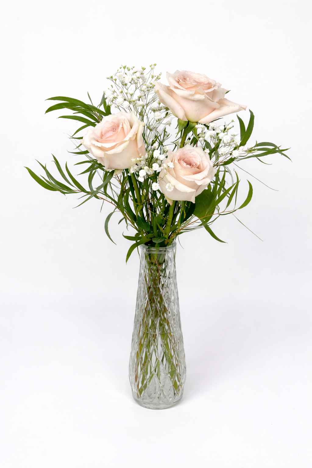 Soft, graceful, and full of meaning, Pinky Promise is a delicate arrangement that symbolizes trust, affection, and heartfelt intentions. Three blush pink roses take the spotlight, representing admiration and gentle love. They’re accented with airy baby’s breath and eucalyptus, adding movement, texture, and a fresh, romantic feel.