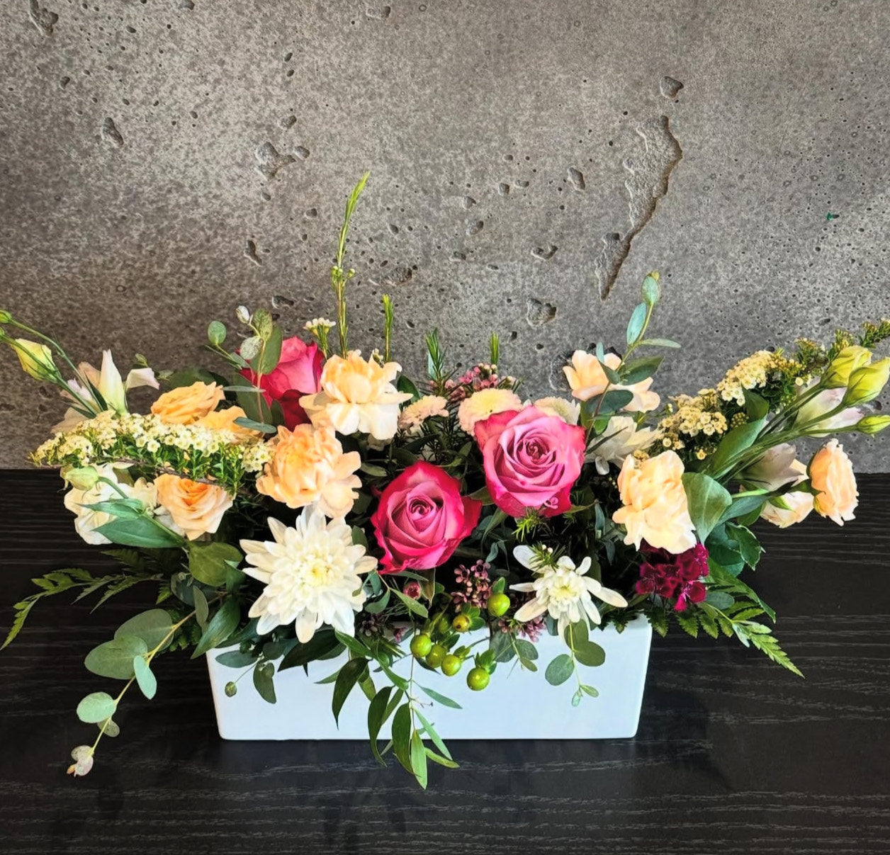 Fresh, cheerful, and full of life the Blair is bursting with bright pink roses, creamy carnations, snow-white mums, delicate yarrow, and lush greenery. Designed in a modern white planter, this long and low arrangement is ideal for dining tables, kitchen islands, and entryways.